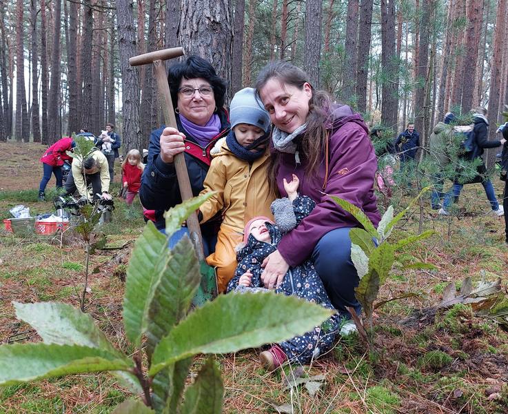 „Magst Du mir helfen?“, fragt Monika Majewski ihren vierjährigen Enkel. Der legt sofort seinen angebissenen Pfannkuchen zur Seite – Arbeit geht vor. „Er möchte später Gärtner werden“, erzählt seine Mama Bianca Majewski, die im vergangenen Jahr bereits für die heute einjährige Tochter den Geburtenwald verstärkt hat. Der Vierjährige kommt mit Nachschub an – er hat Dutzende Setzlinge vom Stapel geholt; der Pfannkuchen ist vergessen. Schon bald steht er, die Hände aneinander reibend, inmitten eines Mini-Wäldchens. Jüngster im Publikum ist wohl Oskar Theodor. Er kam am 4. November in Oranienburg zur Welt; Mama Stefanie Faron, die ihn im Tuch trägt, und Papa Sebastian Rüdiger möchten für ihre nun drei kleinen Kinder Bäume pflanzen. Wie sie die selbstgesetzten Exemplare bei späteren Besuchen wiederfinden? Kinderleicht: „Über die Koordinaten der Fotos.“