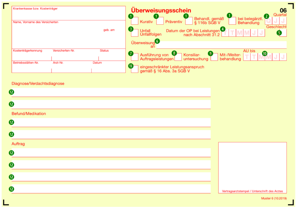 - gelber Überweisungsschein (mit Kreuz für "Behandl. gemäß §116b SGB V" und als Mit-/Weiterbehandlung)